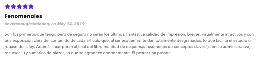 Encontré la página por casualidad buscando sobre la oposición de Administrativo AGE y pedí los bloques de estudio. Estoy encantada. Temario resumido, claro, a todo color y de calidad. Solo lo importante. Lo recomiendo al 100%.